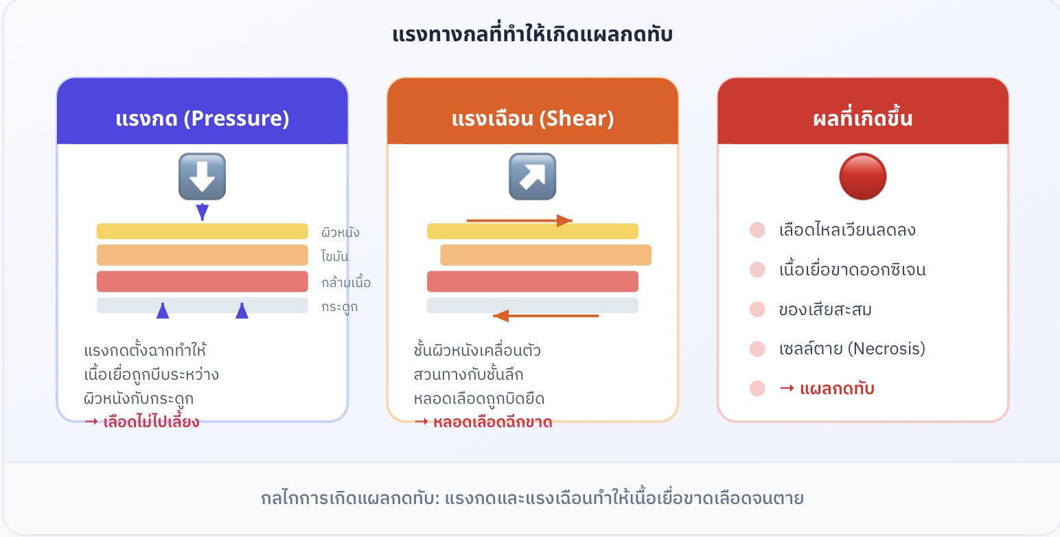 • แรงกด — จากน้ำหนักตัวกดบนปุ่มกระดูก • แรงเฉือน — จากการไหลเลื่อนบนเตียง • แรงเสียดทาน — ผิวหนังถูกครูดกับพื้นผิว • ความชื้น — จากเหงื่อ ปัสสาวะ อุจจาระ • อุปกรณ์ทางการแพทย์ — ท่อ สายต่างๆ |