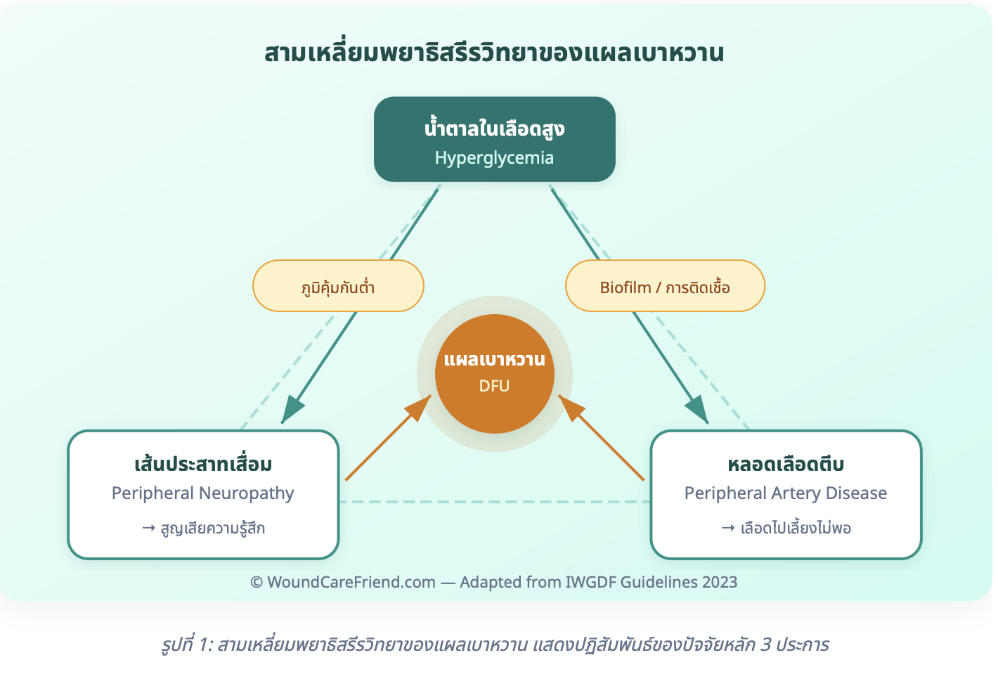 กลไกการเกิดแผลเบาหวานเกิดจากปฏิสัมพันธ์ของ 3 ปัจจัยหลัก ได้แก่ Peripheral Neuropathy, Peripheral Artery Disease และภูมิคุ้มกันบกพร่อง โดยมีน้ำตาลในเลือดสูงเรื้อรังเป็นต้นเหตุร่วม