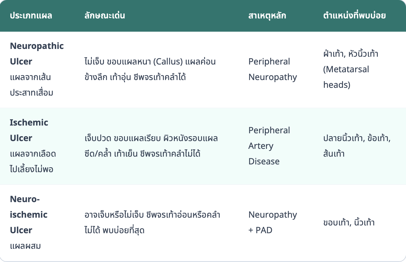 สัญญาณอันตราย (Red Flags) หากมีอาการเหล่านี้ควรไปพบแพทย์โดยเร็วที่สุด: 1. แผลมีหนอง กลิ่นเหม็น - อาจบ่งบอกถึงการติดเชื้อรุนแรง 2. ผิวหนังรอบแผลแดง ร้อน บวม ลุกลาม - สัญญาณของ Cellulitis 3. มีไข้ หนาวสั่น อ่อนเพลียมาก - อาจเป็นสัญญาณของ Sepsis 4. เท้าหรือนิ้วเท้าเปลี่ยนสีเป็นดำ/คล้ำ - บ่งบอกถึง Gangrene 5. แผลไม่ดีขึ้นหลังรักษา 4-6 สัปดาห์ - ควรส่งต่อทีมผู้เชี่ยวชาญ |