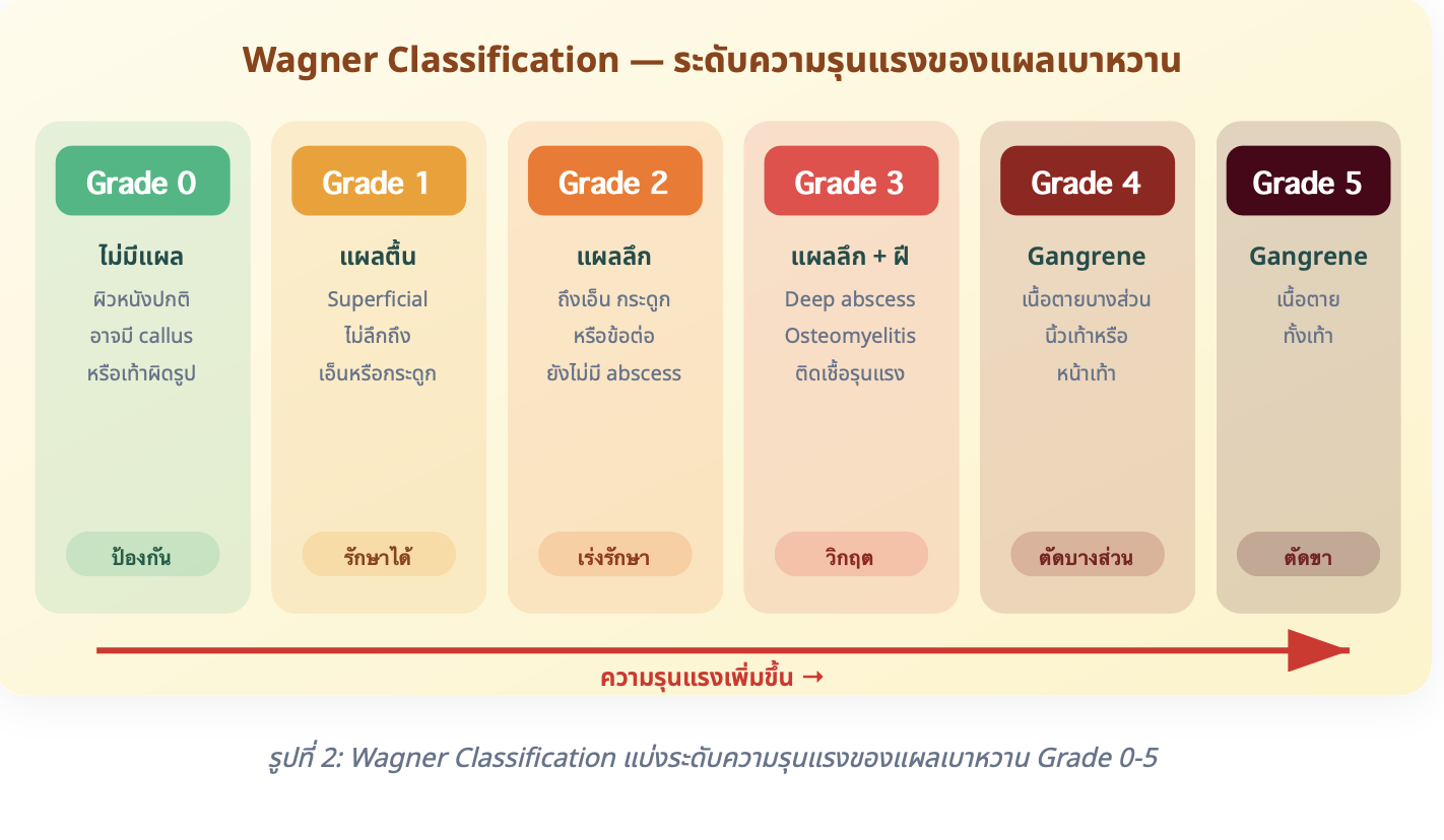 ระบบ Wagner Classification แบ่งความรุนแรงของแผลเบาหวานเป็น 6 ระดับ ตั้งแต่ Grade 0 (ไม่มีแผล แต่มีความเสี่ยง) ไปจนถึง Grade 5 (เนื้อตายทั้งเท้า ต้องตัดขา) ดังตารางต่อไปนี้:
